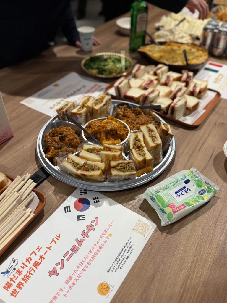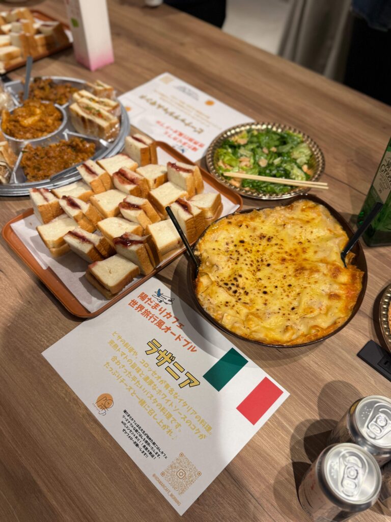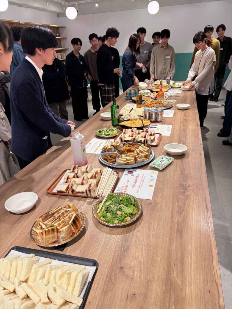 - 懇親会:ラザニアやチーズダッカルビなど、さまざまな料理が並ぶ立食形式でフリートークを実施。